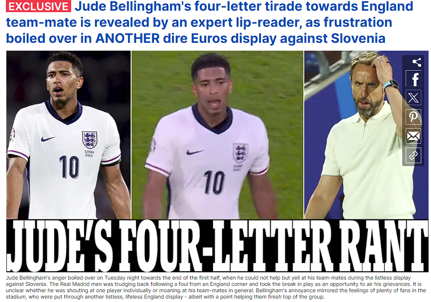 영국 매체 '데일리 메일'은 26일(한국시간) "독순술 전문가 제레미 프리먼은 벨링엄이 팀 동료를 향해 외친 말을 공개했다. 벨링엄은 슬로베니아와 유로 2024 상대로 부진한 경기를 펼치자 분노했고, 동료를 향해 노골적인 비난을 퍼부었다"라고 조명했다.