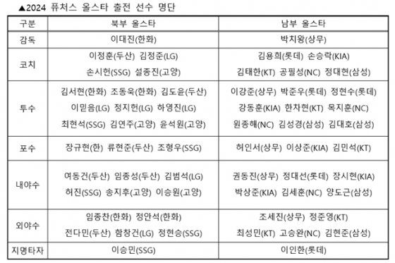 한국야구위원회(KBO)는 오는 7월 5일 오후 6시 인천SSG랜더스필드에서 열리는 2024 KBO 퓨처스 올스타전 출전선수 명단을 27일 발표했다.