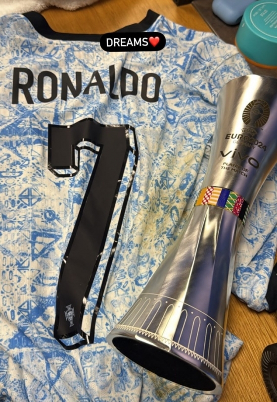 크바라츠헬리아는 경기 최고의 활약을 펼친 선수에게 주어지는 최우수선수(MVP) 상을 거머쥐었다. 끝이 아니었다. 크바라츠헬리아에게 기쁜 일은 또 있었다. 자신의 우상인 포르투갈 공격수 크리스티아누 호날두(39)와 유니폼을 교환했다. 경기를 마치고 크바라츠헬리아는 MVP 트로피와 함께 호날두의 유니폼 사진을 자신의 SNS에 올려 기쁨을 나타냈다.