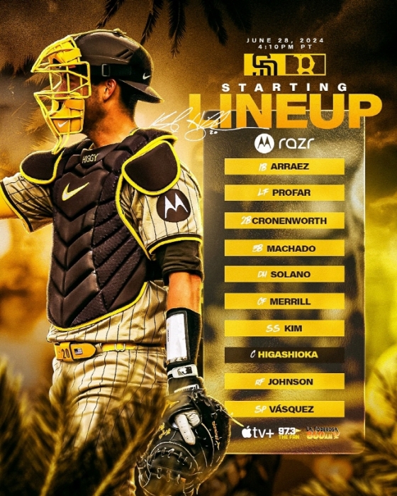 샌디에이고는 이날 루이스 아라에즈(1루수)-주릭슨 프로파(좌익수)-제이크 크로넨워스(2루수) 매니 마차도(3루수)-도노반 솔라노(지명타자)-잭슨 메릴(중견수)-김하성(유격수)-카일 히가시오카(포수)-브라이스 존슨(우익수)으로 선발 라인업을 꾸렸다. 선발 투수는 랜디 바스케스.