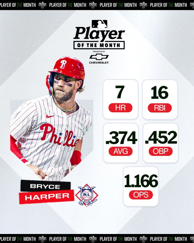 MLB.com은 "하퍼는 6월에 2루타 10개, 홈런 7개, OPS 1.166, 타율 0.374를 기록하며 필라델피아가 최고 성적을 유지하는 데 도움을 줬다. 월말에 부상자 명단에 올랐으나, 건강하게 돌아온다면 2015년, 2021년에 이은 세 번째 MVP도 가능할 것"이라고 이유를 밝혔다.
