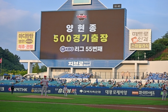 삼성 구단이 4일 대구 KIA전에서 양현종의 통산 500경기 출장 소식을 전광판을 통해 알리고 있다. /사진=KIA 타이거즈 제공