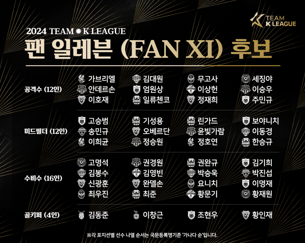 다음은 팀 K리그 '팬 일레븐' 후보 선수 명단 44명