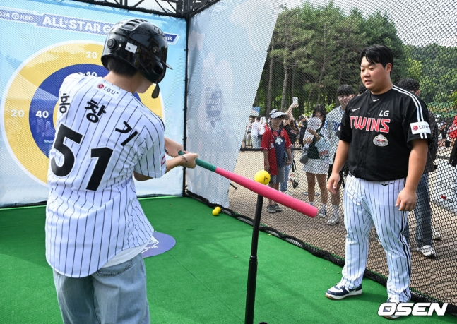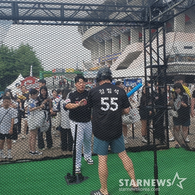 김범석은 5일 인천SSG랜더스필드에서 열린 2024 신한 SOL뱅크 KBO 퓨처스 올스타전에 앞서 팬들과 만났다. 외부 광장 팬 페스트 존에 차려진 레슨장에서 타격에 대한 원포인트 레슨을 진행했고 남녀노소 다양한 팬이 김범석의 지도에 따라 힘차게 배트를 휘둘렀다.