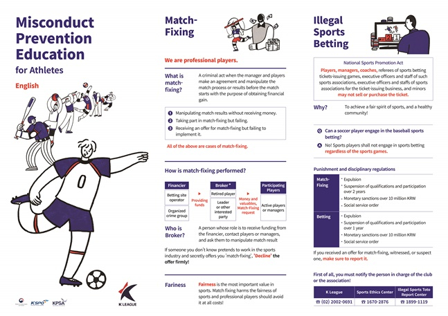 자료는 웹버전으로 제작해 스마트폰이나 태블릿 기기로 편리하게 다운로드할 수 있다. 프로단체와 구단을 통해 소속 외국인 선수와 코칭스태프에게 제공될 예정이며, 프로스포츠 부정행위 방지 교육 시 지참하도록 해 교육 효과와 전달력을 높일 계획이다.