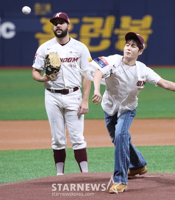 가수 하성운이 키움 선발 헤이수스 앞에서 히어로즈 승리기원 시구를 하고 있다.