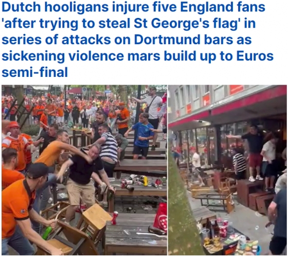 영국 매체 '데일리 메일'은 11일(한국시간) "네덜란드 훌리건들은 독일 도르트문트의 술집에서 잉글랜드 팬 5명에게 부상을 입혔다"라며 "그들은 폭력 사태 속에서 도르트문트 술집을 잇달아 공격했다. 유로 2024 준결승을 앞두고 벌어진 일이다. 오렌지색 축구 유니폼을 입은 몇 명의 사람들이 의자와 벤치를 던지는 영상이 공개됐다"라고 집중 조명했다.