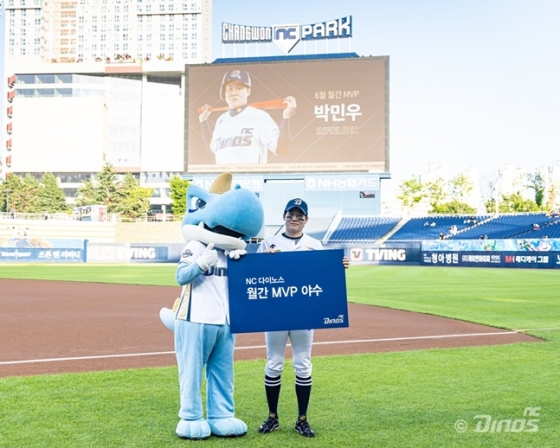 6월 MVP를 받은 박민우와 김영규는 지난 12일 창원NC파크에서 열린 키움 히어로즈와의 홈경기 전 그라운드에서 시상식을 진행했다. MVP로 선정된 선수에게는 상금 100만 원이 전달된다.