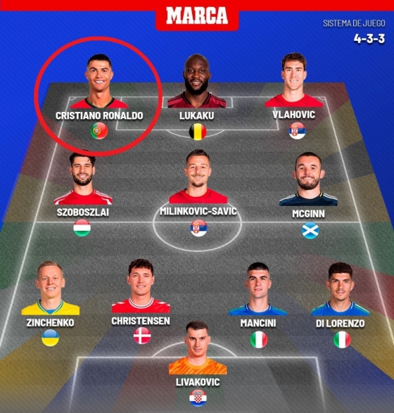 호날두는 최전방 스리톱의 왼쪽 측면 자리에 이름을 올렸다. 그와 함께 로멜로 루카쿠(벨기에), 두산 블라호비치(세르비아)가 대회 최악의 선수로 뽑혔다. 모두 명문팀에서 뛰는 빅네임 선수들이다.