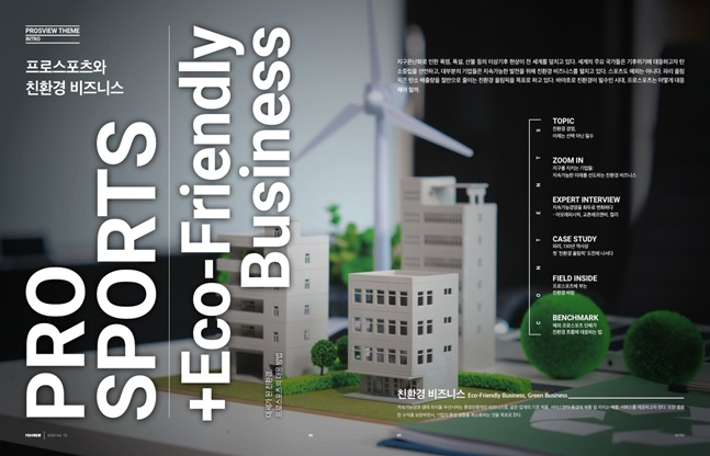 지속적인 기후 변화 이슈와 환경 문제로 인해 기업의 '친환경 경영'이 필수로 요구되는 가운데, 국내외 기업과 프로스포츠의 친환경 비즈니스 사례를 다룬 산업정보 매거진 'PROSVIEW(프로스뷰)' 통권 13호가 발간됐다고 한국프로스포츠협회가 15일 밝혔다.