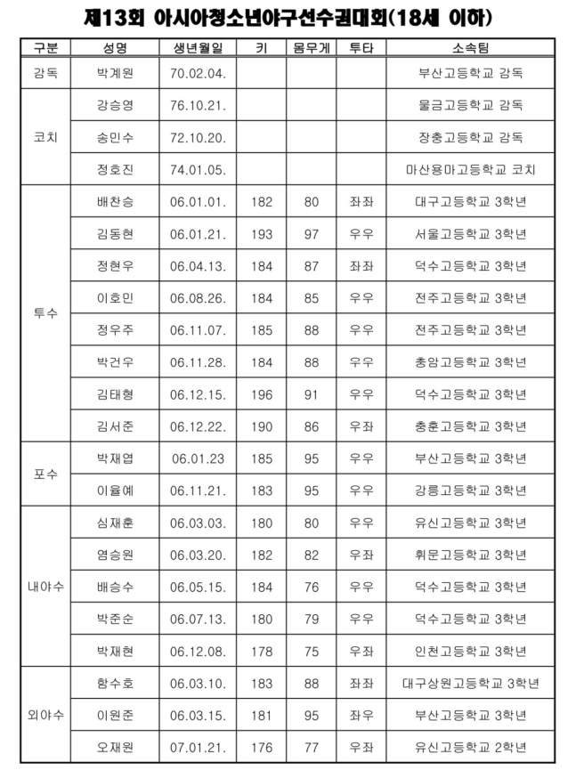 대한야구소프트볼협회(KBSA)는 "오는 9월 2일부터 9월 8일까지 대만 타이베이에서 개최되는 제13회 아시아 청소년야구선수권대회(18세 이하)에 참가할 청소년 국가대표 코칭스태프와 선수를 최종 확정했다"고 17일 발표했다.