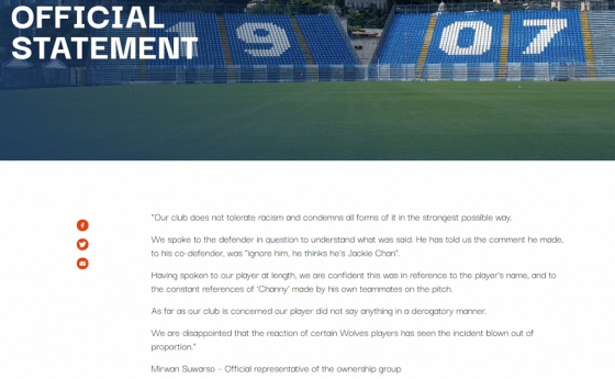 심지어 코모의 경기 후 성명문은 인종차별 사태에 기름을 부은 꼴을 만들었다. 코모는 공식 홈페이지를 통해 "선수들에게 직접 확인했다. 황희찬에 대해 한 선수는 '그(황희찬)를 무시해. 마치 본인이 재키찬(성룡)인 줄 아나 봐'라고 말했다더라"라며 "울버햄튼 선수들이 과하게 반응한 것이 사건을 더 크게 만들어 유감이다"라고 밝혔다. 동양인은 모두 비슷하게 생겼다는 의미로 비롯된 해당 발언은 명백한 인종차별이었지만, 코모는 변명만 늘어놨다.