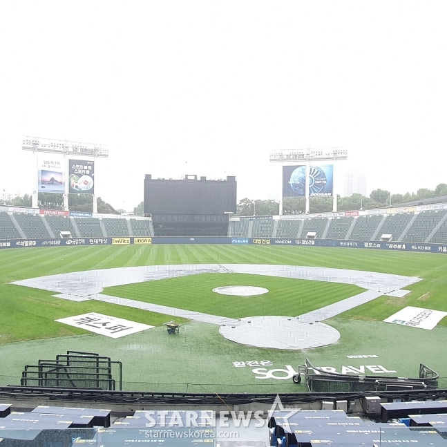 그러나 너무 많은 비가 쏟아져 잠실구장 그라운드 곳곳에 물웅덩이를 만들었다. 1루와 3루, 외야 워닝 트랙과 중앙 외야 잔디 쪽에도 물이 흥건히 고였고 구장 관리자들이 틈틈이 나와 그라운드 상태를 살폈다.
