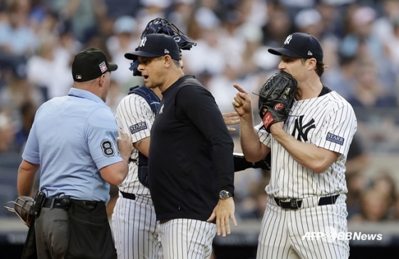 20일(한국시간) 미국 뉴욕주 브롱스의 양키 스타디움에서 열린 뉴욕 양키스와 탬파베이 레이스의 2024 메이저리그(MLB) 정규시즌 경기. 2회 초 첫 투구가 시작되기 전 양키스 쪽에서 항의가 나왔다.