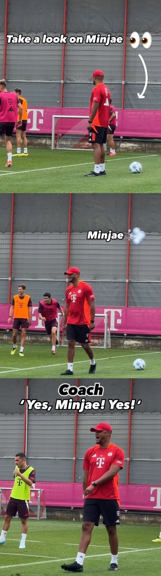 김민재는 2024~2025시즌을 앞두고 프리 시즌 훈련이 한창이다. 뮌헨은 새 시즌을 맞아 토마스 투헬 감독과 결별하고 콤파니 감독이 새로 지휘봉을 잡았다. 뮌헨은 지난 18일 구단 SNS를 통해 팀 훈련 모습을 공개했는데 콤파니 감독이 김민재의 플레이를 보고 "예스(그래!)"를 연발하며 만족하는 모습을 보였다.
