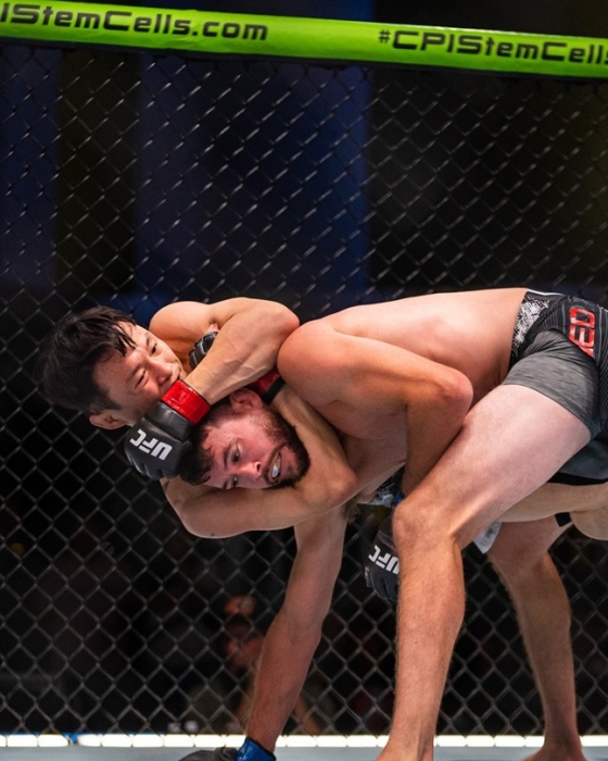 1라운드 초반부터 알지오는 최두호의 다리를 공략했다. 최두호는 알지오의 머리를 강하게 감싸며 반격했다. 이후 알지오를 들어서 넘기며 유리한 포지션을 잡은 최두호는 이번엔 목을 감싸며 공격했다.