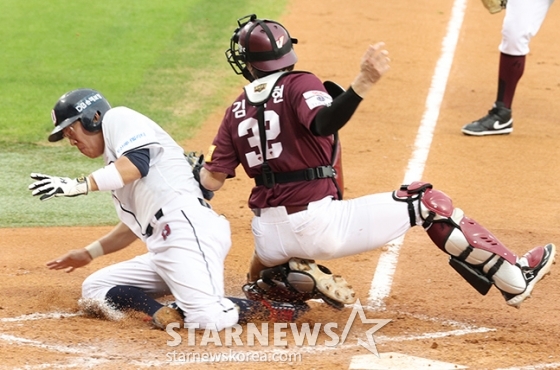 두산 3회말 2사 2루에서 2루주자 허경민이 양의지의 적시터 때 홈으로 뛰어 세이프되고 있다. 키음 포수는 김재현.