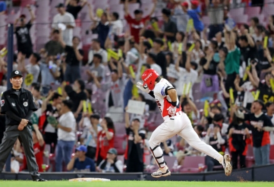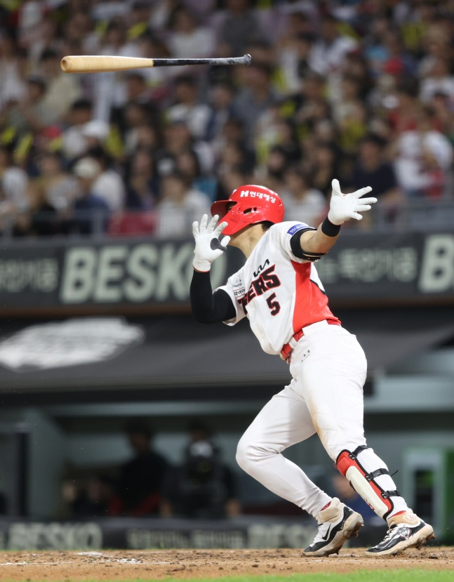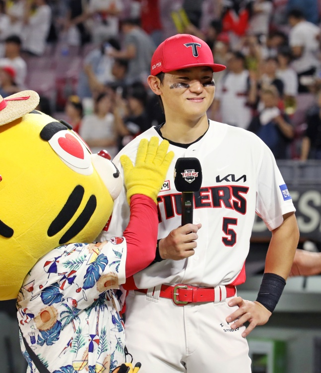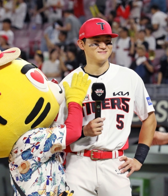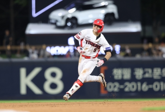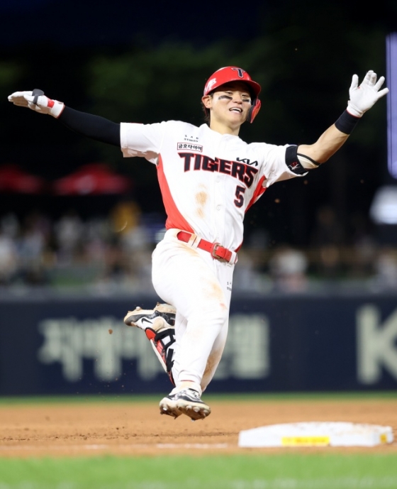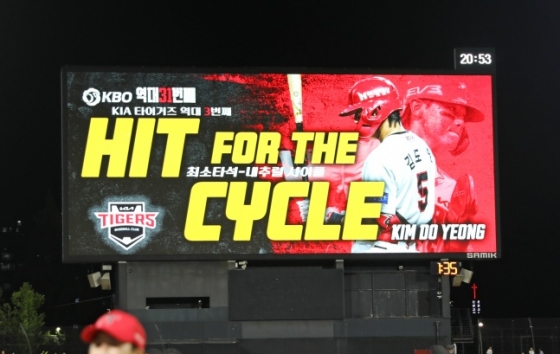 그러나 이 2루타가 있어 대기록이 가능해졌다. 5회 말 1사에서 김도영은 카스타노의 바깥쪽으로 떨어지는 시속 135km 슬라이더를 공략해 좌중간 외야를 가르는 3루타를 만들었다. 이때는 거침없이 질주해 미소와 함께 3루에 도달했다.