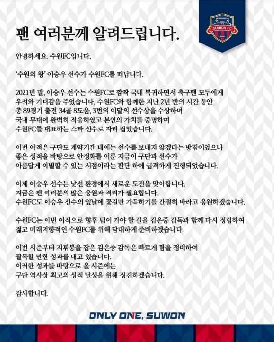이어 수원FC는 "이번 이적은 구단도 계약기간 내에는 선수를 보내지 않겠다는 방침이었다. 다만 구단은 좋은 성적을 바탕으로 안정화를 이룬 지금이 구단과 선수가 아름답게 이별할 수 있는 시점이라는 판단하에 이적을 빠르게 진행했다"라며 "이승우는 이제 새로운 도전을 맞이한다. 팬 여러분의 많은 응원과 격려가 필요하다"라고 전했다.