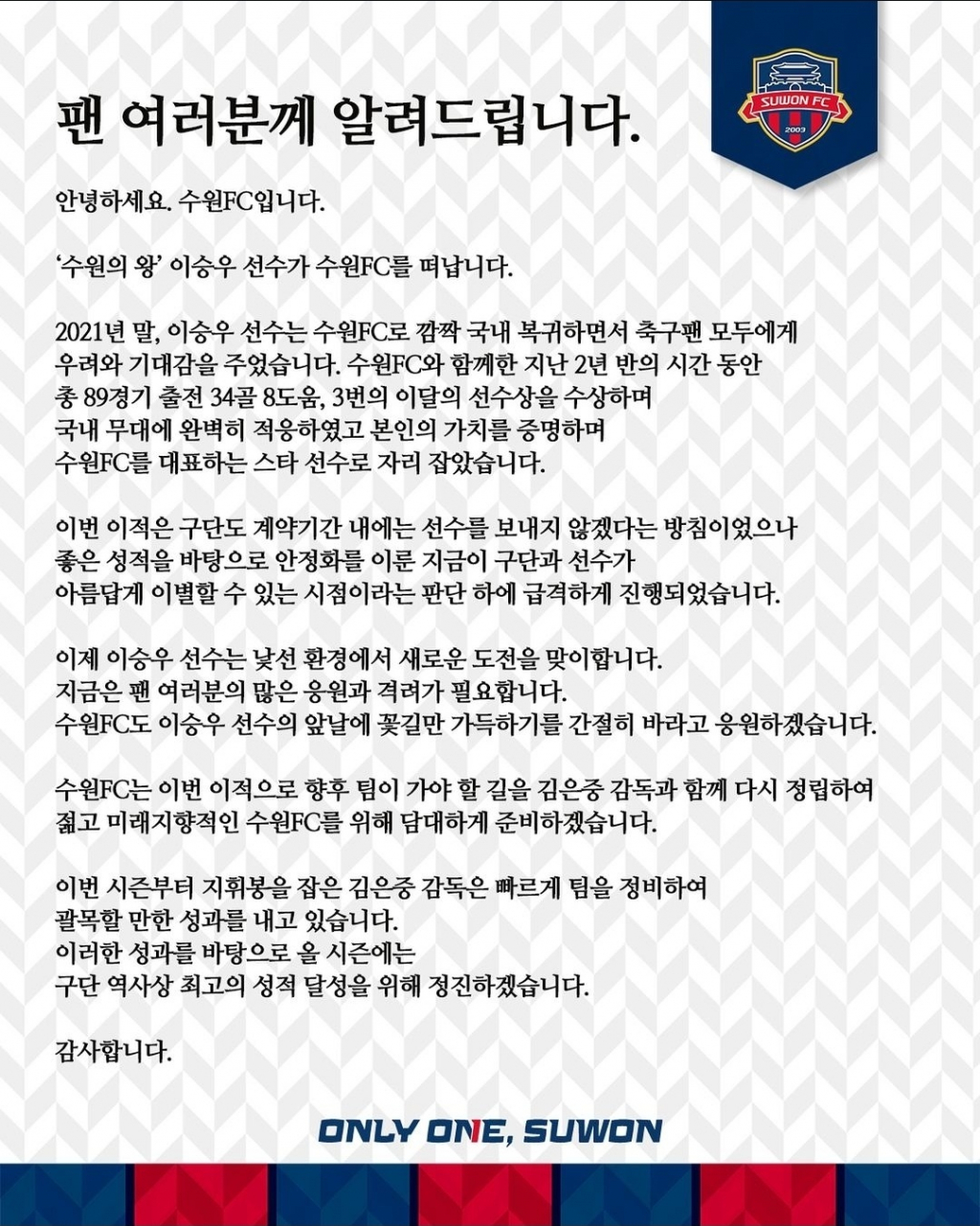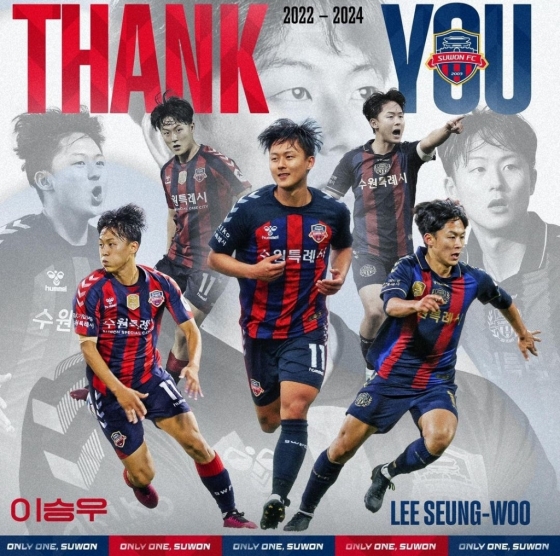 수원FC는 24일 공식 채널을 통해 "수원의 왕 이승우 선수가 수원FC를 떠난다"라며 "2021년 말 국내로 깜짝 복귀한 이승우는 축구팬 모두에게 우려와 기대감을 주었다. 지난 2년 반 동안 이승우는 89경기 34골 8도움, 3번의 이달의 선수상을 받았다. 앞날에 꽃길만 가득하길 간절히 바란다"라고 발표했다.