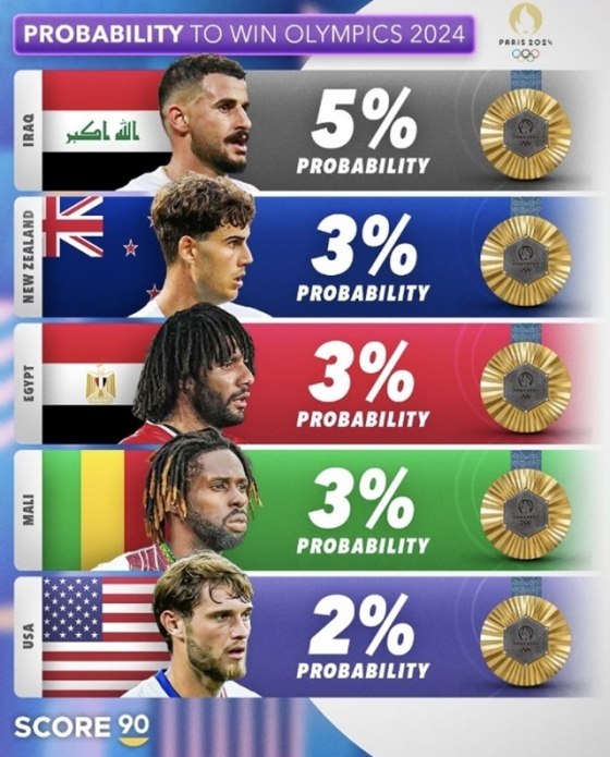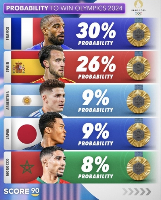 축구전문 스코어90은 27일(한국시간) 베팅업체 북메이커의 통계를 빌려 파리 올림픽 축구 종목 우승후보 톱10을 공개했다.