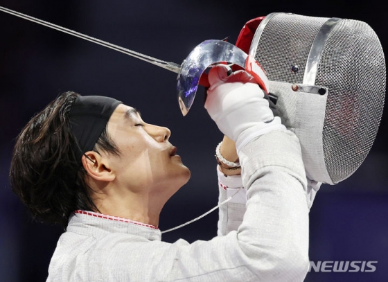오상욱이 27일(현지시간) 프랑스 파리 그랑 팔레에서 열린 2024 파리 올림픽 펜싱 남자 사브르 개인 결승전에서 펜싱 마스크를 쓰고 있다. /사진=뉴시스