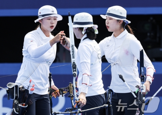 대한민국 양궁대표팀 임시현, 남수현, 전훈영이 28일(한국시간) 프랑스 파리 레쟁발리드 특설 사로에서 열린 2024 파리올림픽 양궁 여자 단체전 대만과의 8강전에 앞서 파이팅을 외치고 있다. /사진=뉴스1
