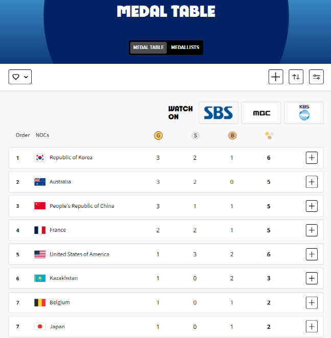 이로써 금메달 3개, 은메달 2개, 동메달 하나가 된 한국은 종합 순위에서 1위로 도약했다. 한국은 금메달 5개, 종합 순위 15위 이내를 목표로 이번 올림픽에 나섰는데 그 목표치에 빠르게 근접하고 있다.