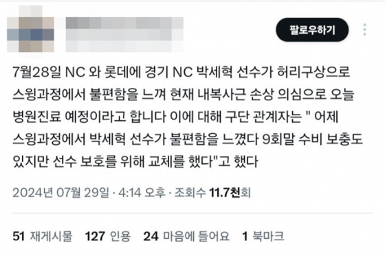 29일 X(구 트위터)에는 한 누리꾼이 박세혁(34)의 부상 소식을 유포했다. 이에 따르면 박세혁은 지난 28일 열린 롯데 자이언츠와 홈 경기에서 스윙 도중 불편함을 느꼈고, 내복사근 손상 의심 진단을 받았다는 것이다.