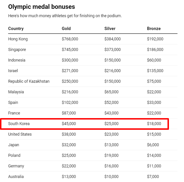 한국은 금메달 4만 5000달러(6210만원), 은메달 2만 5000달러(3450만원), 동메달 1만 8000달러(2487만원)로 집계됐다. 매체는 "한국 메달리스트들은 포상금 외에 연금을 추가로 받는다"고 소개했다. 미국은 금메달 3만 8000달러, 일본은 금메달 3만 2000달러(4419만원)로 한국보다 적었다.