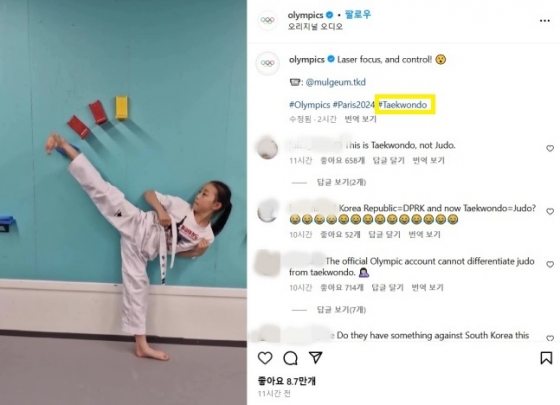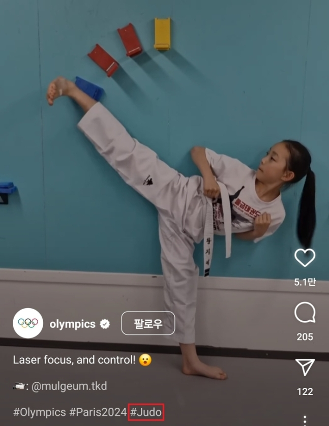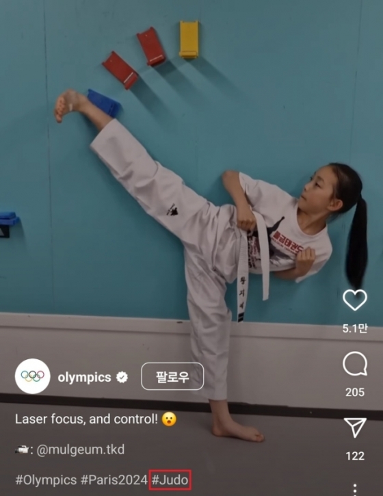 IOC는 31일(한국시간) 공식 SNS를 통해 여자아이들이 한글이 써진 티셔츠와 띠를 입은 채 태권도 훈련을 하는 영상을 게재했다. 그러면서 태그에는 올림픽, 파리 2024, 유도를 올려 팬들의 의문을 자아냈다.