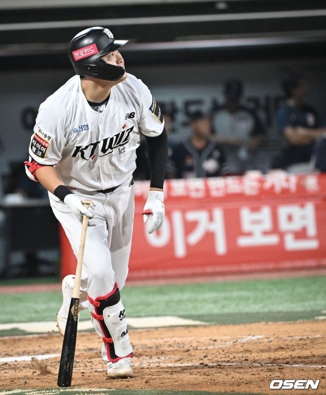 이강철 감독은 31일 한화전을 앞두고 취재진과 만나 "우리가 바라는 게 한 방이다. 안타 치는 것보다 한 번 쳐주면 도움이 된다"며 타율이 좋지 않음에도 "항상 맞으면 간다는 기대감은 있다. 잘 맞지 않고 있지만 맞으면 뭔가 이뤄진다. 이런 건 확실히 있다"며 "툭 치는데도 기대감이 있다. 방망이 칠 때보면 어떻게 저렇게 (멀리) 치지하는 생각이 든다"고 말했다.