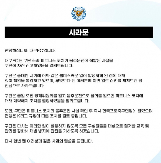 대구는 1일 구단 공식 채널을 통해 "소속 피트니스 코치가 음주 운전에 적발된 사실을 구단에 자진 신고했다"면서 "중대한 시기에 불미스러운 일이 발행해 책임을 통감한다. 팬들에게 이번 일로 심려를 끼쳐 사과한다"고 밝혔다.