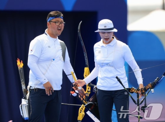 대한민국 양궁 대표팀 김우진, 임시현 선수가 2일 오후(한국시간) 프랑스 파리 앵발리드에서 진행된 파리올림픽 양궁 혼성 단체 8강 이탈리아의 키아라 레발리아티, 마우로 네스폴리 조와의 경기에서 함성을 지르고 있다. /사진=뉴스1