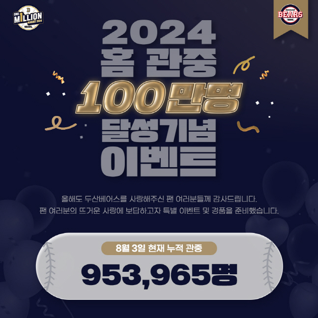 올 시즌 프로야구 흥행을 이끌고 있는 두산 베어스가 홈 관중 100만 달성 이벤트를 마련했다.