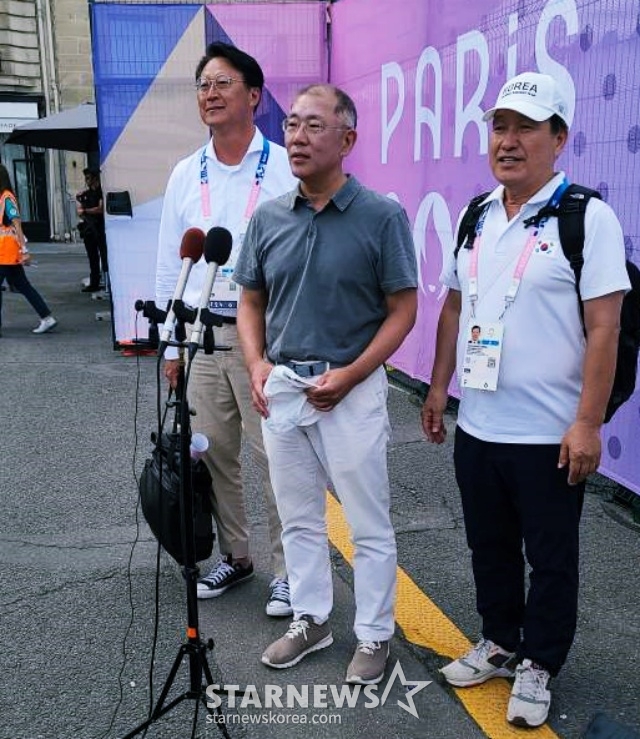이날 정의선 회장은 김우진이 금메달을 따낸 앵발리드 현장을 찾아 경기를 직접 지켜봤다. 정 회장은 앵발리드 현장에서 한국 취재진과 만나 "일단 우리 선수들께 제일 고맙다. 선수들이 꿈꾸는 걸 이뤄서, 선수들 본인이 가진 기량을 살려 이 모든 걸 이뤘다는 게 제일 기쁘다"고 입을 열었다.