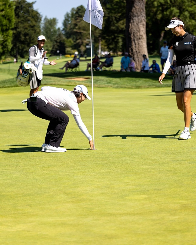 16번 홀(파3)에선 행운도 따랐다. 그린 초입에 떨어진 아이언 티샷이 한참을 굴러가 홀로 빨려 들어갔다. 환성 소리를 듣고 뒤늦게 상황을 파악한 안나린은 캐디, 동료들과 하이파이브를 나누며 기뻐했다.