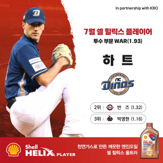 투수 부문에서는 월간 WAR 1.93을 기록한 NC 하트가 선정됐다. 하트는 지난달 12일 경기에서 시즌 8승으로 구단 역대 좌완 외국인 투수 최다승 기록을 세웠다. 이후 경기에서 2승을 추가하며(시즌 10승) 해당 기록을 경신해가고 있다.