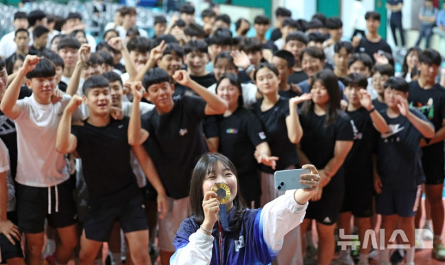 만 16세의 사격 금메달리스트 반효진이 재학 중인 대구체육고등학교를 찾아 열렬한 환영을 받았다.