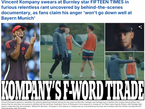 영국 매체 '데일리 메일'은 12일(한국시간) "콤파니 감독은 번리(현 잉글랜드 챔피언십) 시절 훈련장에서 팀 핵심 선수를 향해 15번이나 욕설을 쏟아냈다"며 "뮌헨 팬들은 그의 분노가 지금 팀에는 잘 받아들여지지 않을 것이라 주장했다"고 조명했다.