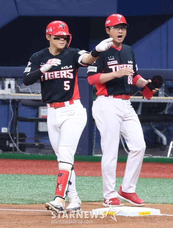 스포츠야구[포토] 김도영 '코치님 뭘 그리 놀라시나요'발행 : 2024.08.13 ・ 19:00조회수 :고척=김진경 대기자'2024 신한 SOL 뱅크 KBO리그' 키움-KIA전이 13일 서울 고척스카이돔에서 열렸다.KIA 김도영이 1회초 2사에서 중전 안타를 날리고 출루한 후 이현곤 코치의 환영을 받고 있다.<저작권자 © 스타뉴스, 무단전재 및 재배포 금지>브리핑추천 기사김진경 대기자기자홈좋아요스포츠-야구의 인기 급상승 뉴스스포츠-야구의 최신 뉴스AD