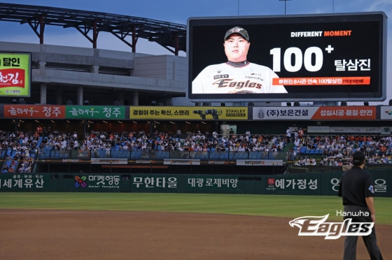 한화 선발 류현진은 5이닝 2피안타 2볼넷 6탈삼진 무실점으로 호투했으나 승리와 연을 맺지 못했다. 올 시즌 성적은 6승 7패 평균자책점 4.10. 이어 박상원과 김서현이 1이닝씩 투구한 뒤 김규연(⅓이닝), 이상규(0이닝), 주현상(1⅔이닝)이 차례로 나와 투구했다. 패전 투수는 주현상. 류현진은 KBO 리그 8시즌 연속 100탈삼진(KBO 역대 5번째)에 성공했다. 데뷔 시즌이었던 2006시즌부터 메이저리그 진출 직전인 2012시즌까지 7년 연속 세 자릿수 탈삼진을 마크한 류현진은 올 시즌 105개의 탈삼진을 기록 중이다.