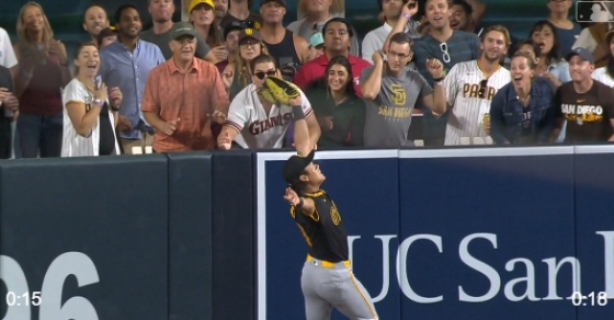 그러나 배지환이 날았다. MLB 최상위 수준 스프린트 스피드를 과시하며 빠르게 달려나온 배지환은 전방으로 다이빙을 했고 타구를 낚아챘다. 3루 주자의 득점은 막을 수 없었으나 안타로 판단해 리드 폭을 늘렸던 2루 주자의 진루는 저지했다.