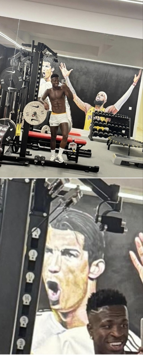 축구전문 433은 13일(한국시간) 비니시우스의 웨이트 훈련장을 공개했다. 상의를 벗어던진 비니시우스는 훈련 도중 셀카를 찍었다. 눈에 띄는 것은 훈련장에 그려진 대형 벽화. 월드클래스 공격수 크리스티아누 호날두(알나스르), 미국프로농구(NBA)를 대표하는 '슈퍼스타' 르브론 제임스(LA레이커스)의 모습이 담겨져 있었다.