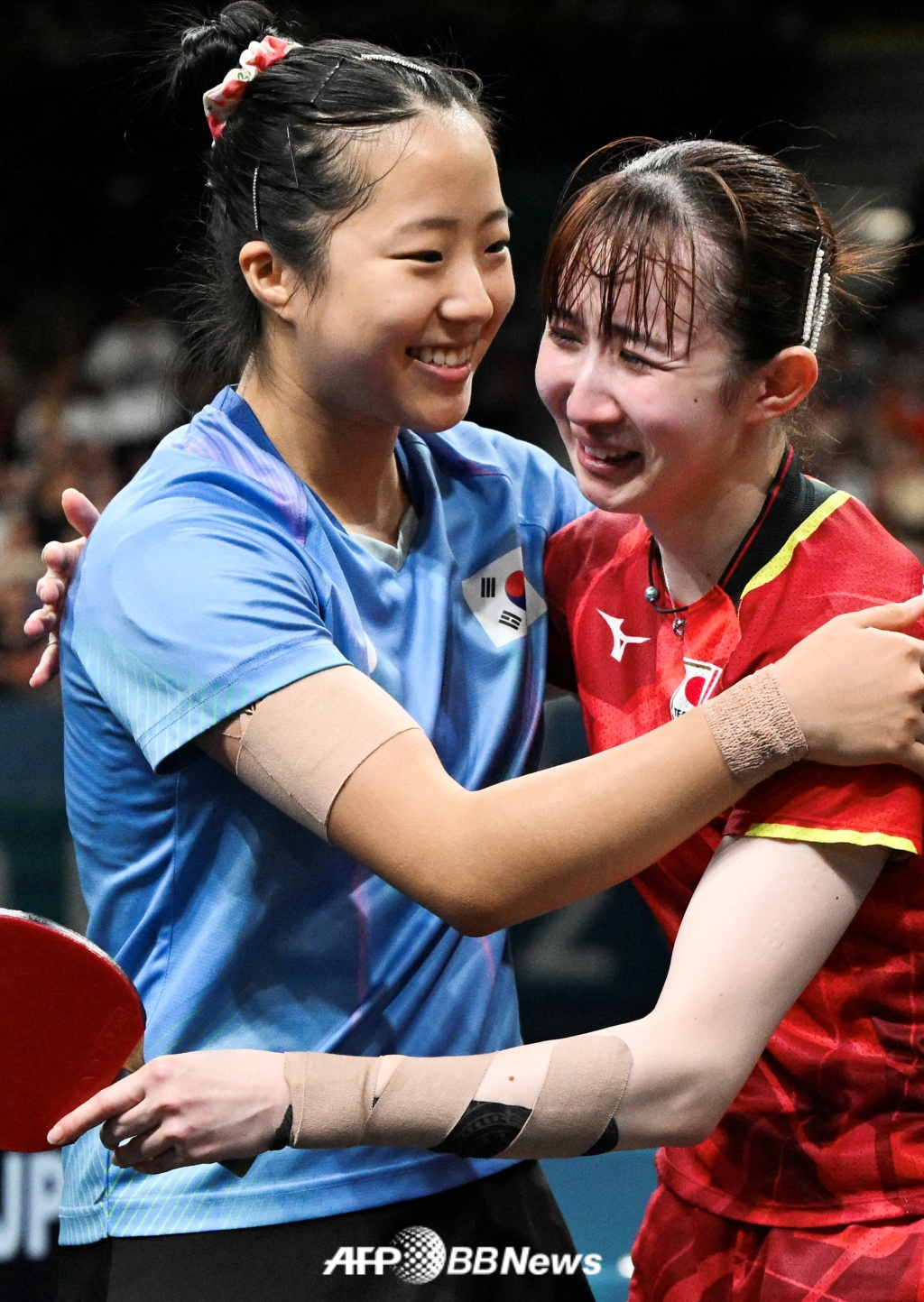 이후 신유빈은 벤치로 돌아온 뒤 한동안 코트를 떠나지 못한 채 그대로 앉아있었다. 신유빈에게 오광헌 여자 탁구 대표팀 감독은 무언가 한참 동안 말을 건넸다. 그리고 얼마 후 신유빈이 일어섰다. 그러자 관중석에서는 힘찬 박수가 터져 나왔다. 신유빈은 코트를 한 바퀴 돌면서 손을 흔든 뒤 꾸뻑 인사도 했다. 그런 신유빈을 향해 한국과 중국, 일본 팬들은 물론, 이날 경기장을 찾은 파리 시민들도 신유빈이 경기장을 완전히 빠져나갈 때까지 뜨거운 기립박수를 보냈다.