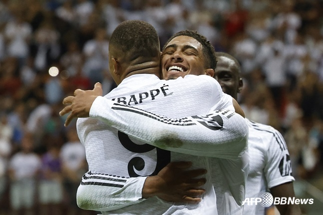 지난달 레알로 이적한 음바페는 이날 데뷔전 데뷔골을 터트렸다. 벨링엄과 환상의 호흡으로 추가골을 합작했다. 1-0으로 앞선 후반 24분 벨링엄이 페널티박스 왼편에서 낮게 찔러준 패스를 음바페가 오른발로 차 넣어 골망을 흔들었다. 음바페는 시그니처 세리머니를 펼친 뒤 벨링엄에게 달려가 포옹했다.