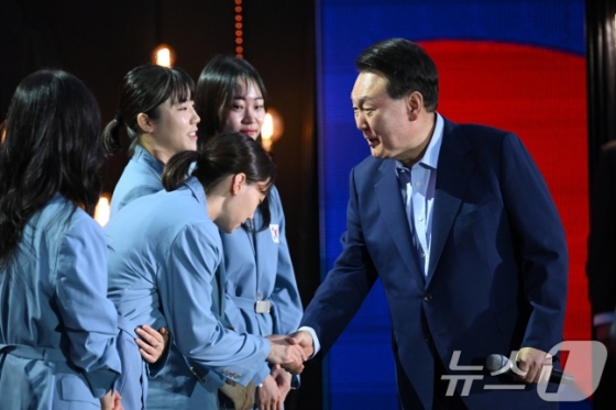 윤 대통령은 최소 규모 선수단 구성에도 불구하고 금메달 13개를 포함해 총 메달 수 32개로 최고 성적을 낸 선수들을 격려하기 위해 이날 행사에 깜짝 등장했다. 윤 대통령은 노타이 차림으로 나섰다. 이어 단상의 사격·펜싱·양궁·태권도 종목 선수들과 악수를 나누며 "수고했어요"라는 인사를 전했다.