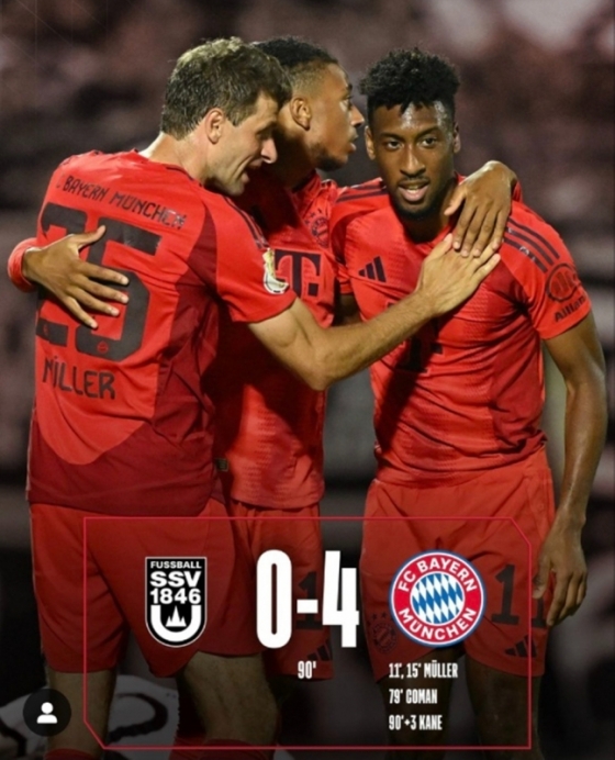 베테랑 공격수 뮐러는 전반에만 2골을 뽑아냈다. 이후 뮌헨은 후반 34분 킹슬리 코망의 추가골, 후반 추가시간 교체로 들어간 해리 케인의 쐐기골까지 더해 4골차 대승을 수확했다.