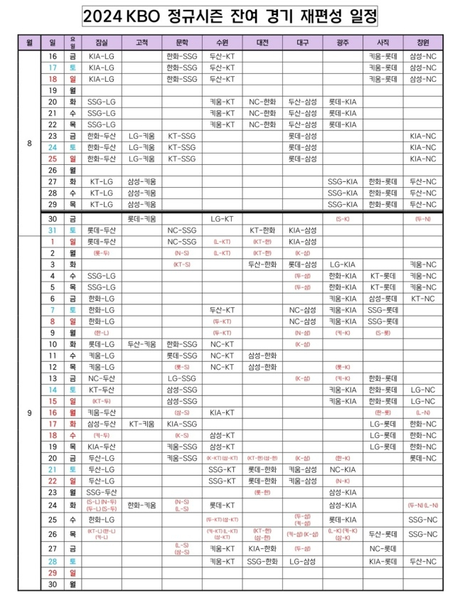 편성된 경기는 미편성 50경기와 우천 순연 경기 등을 포함해 재편성이 필요한 52경기로 총 102경기이며, 9월 28일까지 편성됐다.