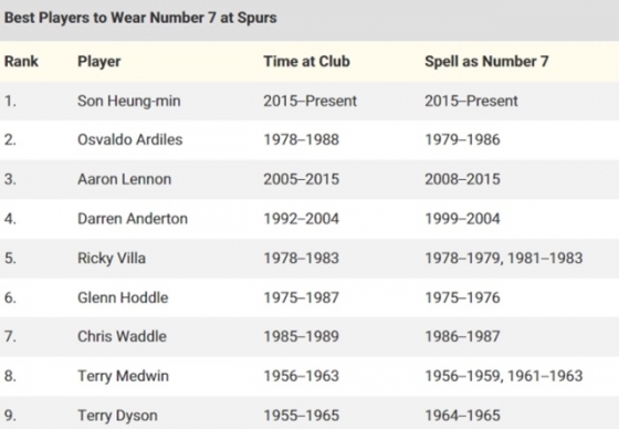 영국 기브미스포츠는 17일(한국시간) "모든 클럽에서 일부 등번호는 다른 등번호보다 더 큰 명예를 갖고 있다. 그 중 하나는 7번"이라며 "등번호 7번은 공격적이고 대담하며, 팬들을 자리에서 일어날 수 있게 해야 한다. 많은 시간을 걸쳐 수많은 토트넘 선수들이 그렇게 했다"며 토트넘 역대 7번 순위를 매겼다. 총 9명의 선수가 이름을 올렸고, 이 가운데 대한민국 공격수 손흥민이 당당히 1위를 차지했다.
